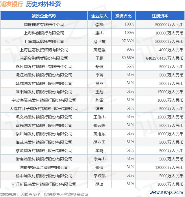 本站音信,阐发天眼查APP露出,浦发银行(600000.SH)新增一说念对外投资事件,被投资公司为广州广钢气体动力股份有限公司,法定代表东说念主邓韬,投资占比为1.08%。该公司从事化学原料和化学成品制造业,注册成本为131939.8521万东说念主民币。现在,浦发银行共存在对外投资155项,投资占比前20的名堂见下表: