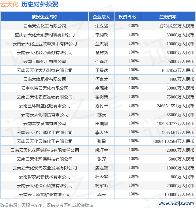 本站音尘,凭据天眼查APP表示,云天化(600096.SH)新增全部对外投资事件,被投资公司为天驰物流有限职守公司,法定代表东说念主夏应江,投资占比为31.62%。该公司从事其他管业绩,注册老本为14624.44万东说念主民币。现在,云天化共存在对外投资47项,投资占比前20的式样见下表: