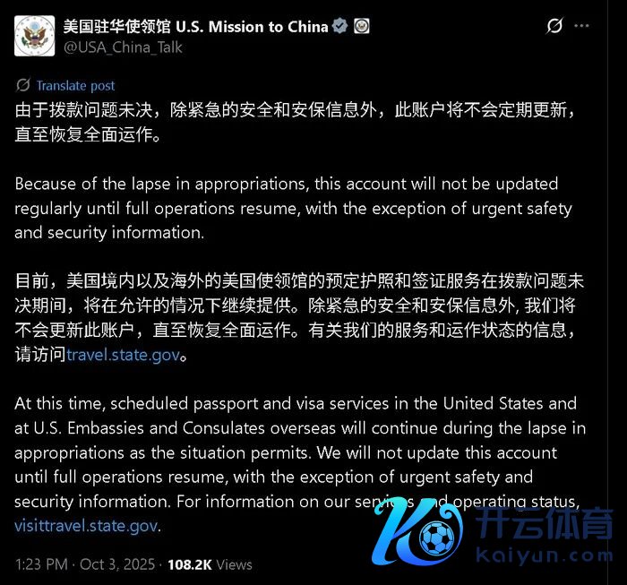 据全球时报此前报谈,北京时刻10月3日下昼1时23分,好意思国驻华使领馆在好意思国酬酢平台X上的官方账号上晓喻,由于拨款问题未处置,除蹙迫的安全和安保信息外,此账户将不会如期更新,直至规复全面运作。